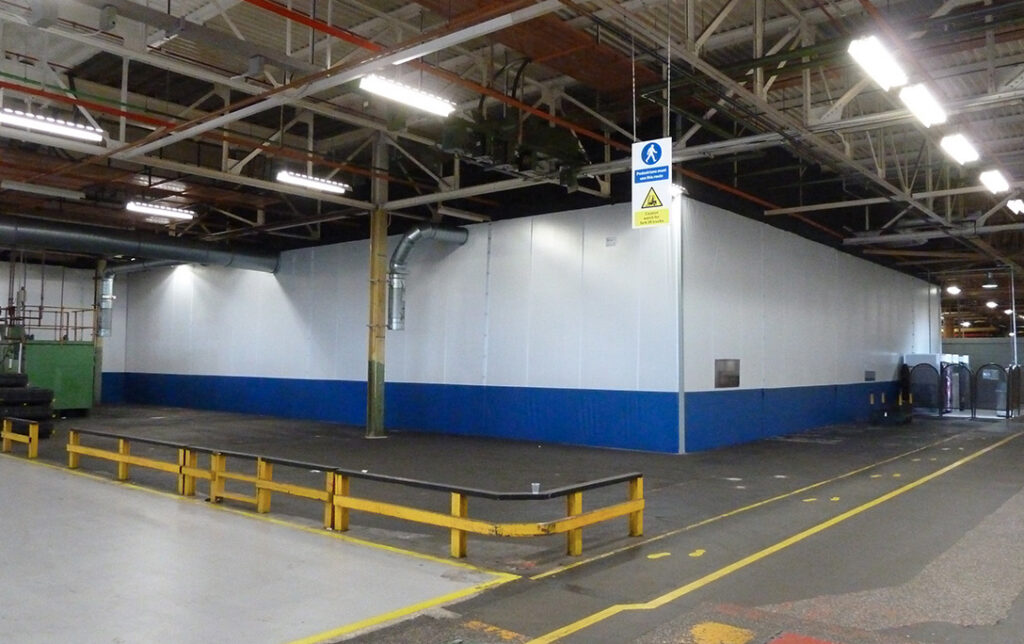 Due to the numerous high-level services/penetrations and the active and clean nature of the surrounding gearbox production line, a conventional rigid partition system would have been too disruptive to build, too permanent and too expensive. Furthermore, future take down would be even more disruptive with disposal implications.