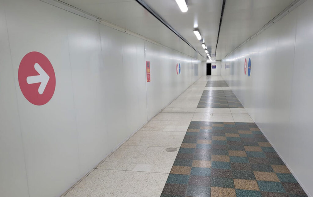 The 52.5 linear metre tunnel needed to be created using 60-minute fire-rated panels as well having weatherproofing properties, due to the roof of the building being removed it therefore left the site open to the elements during the phased works. The Hoardfast Firescreen panels also act as barriers and can serve as crowd control measures, especially during high-traffic periods while also allowing for efficient security.